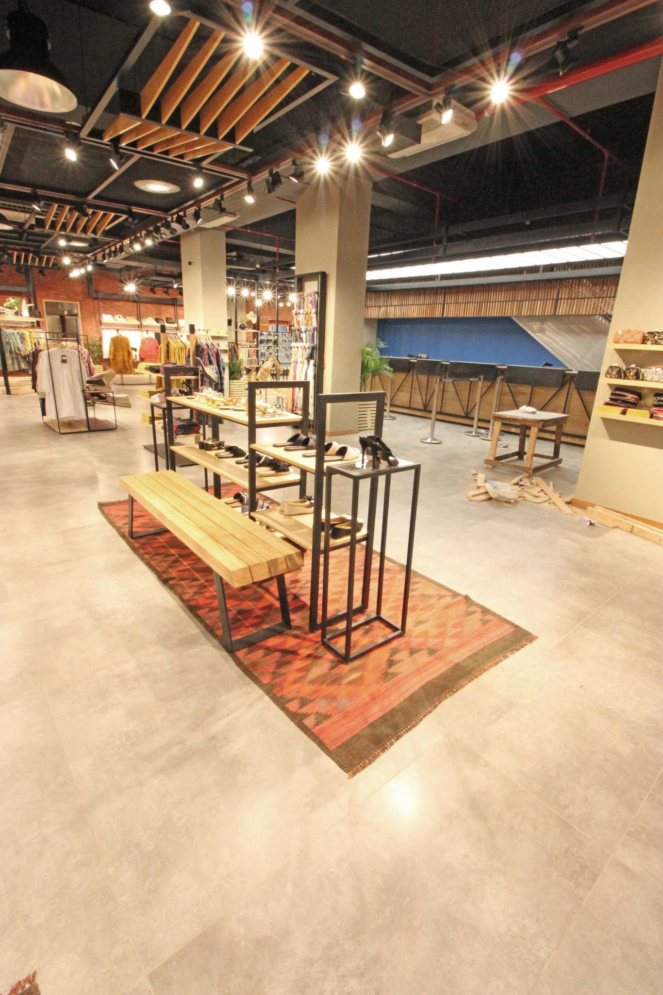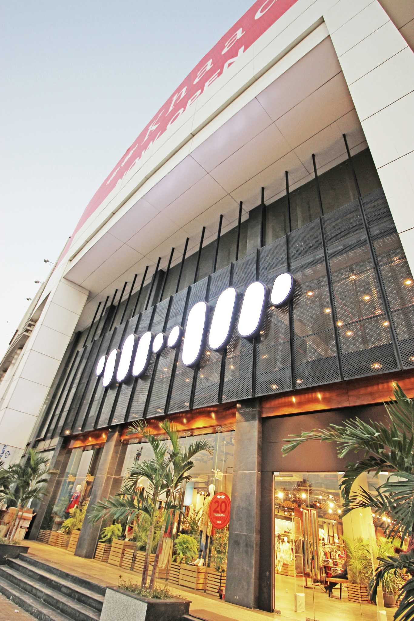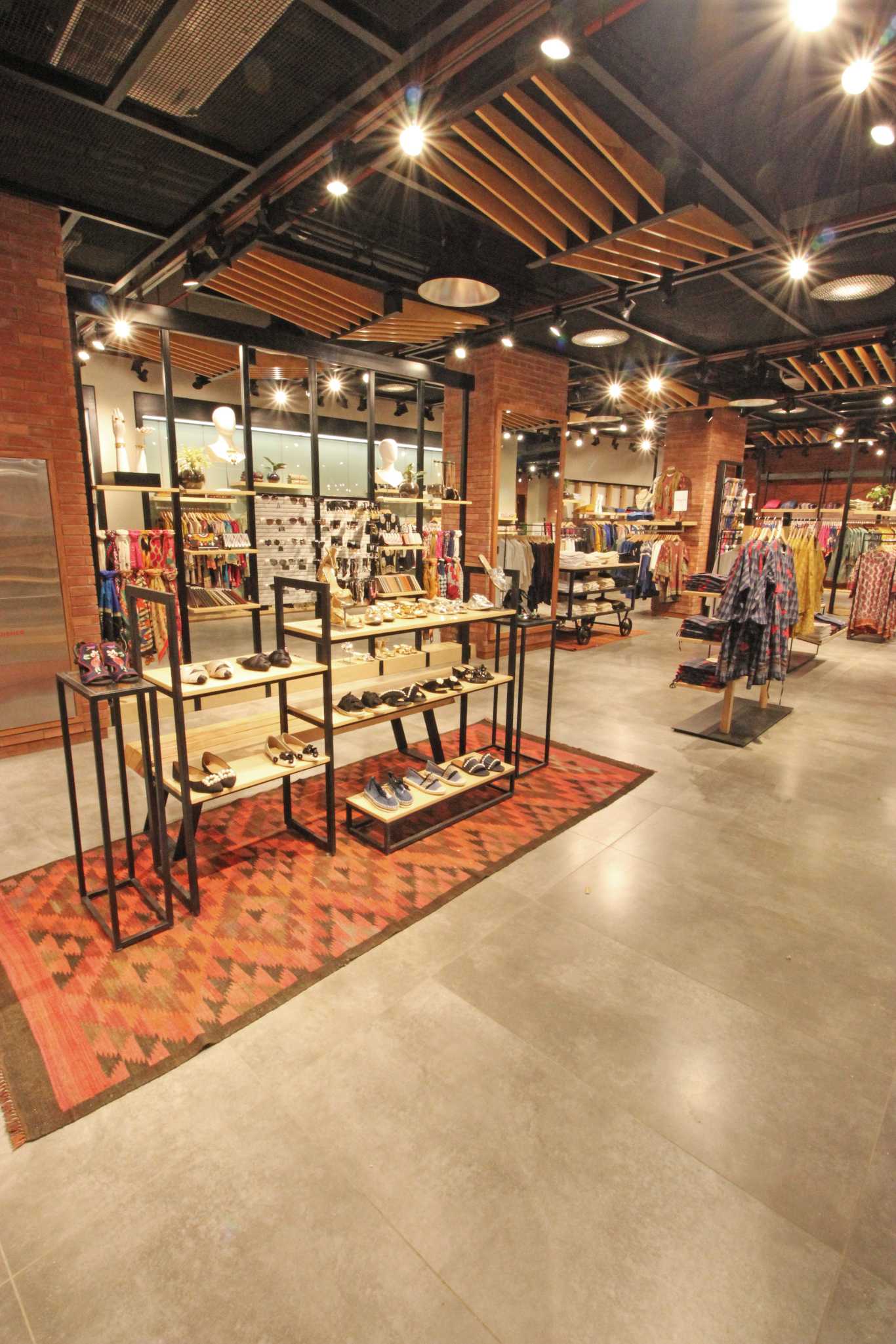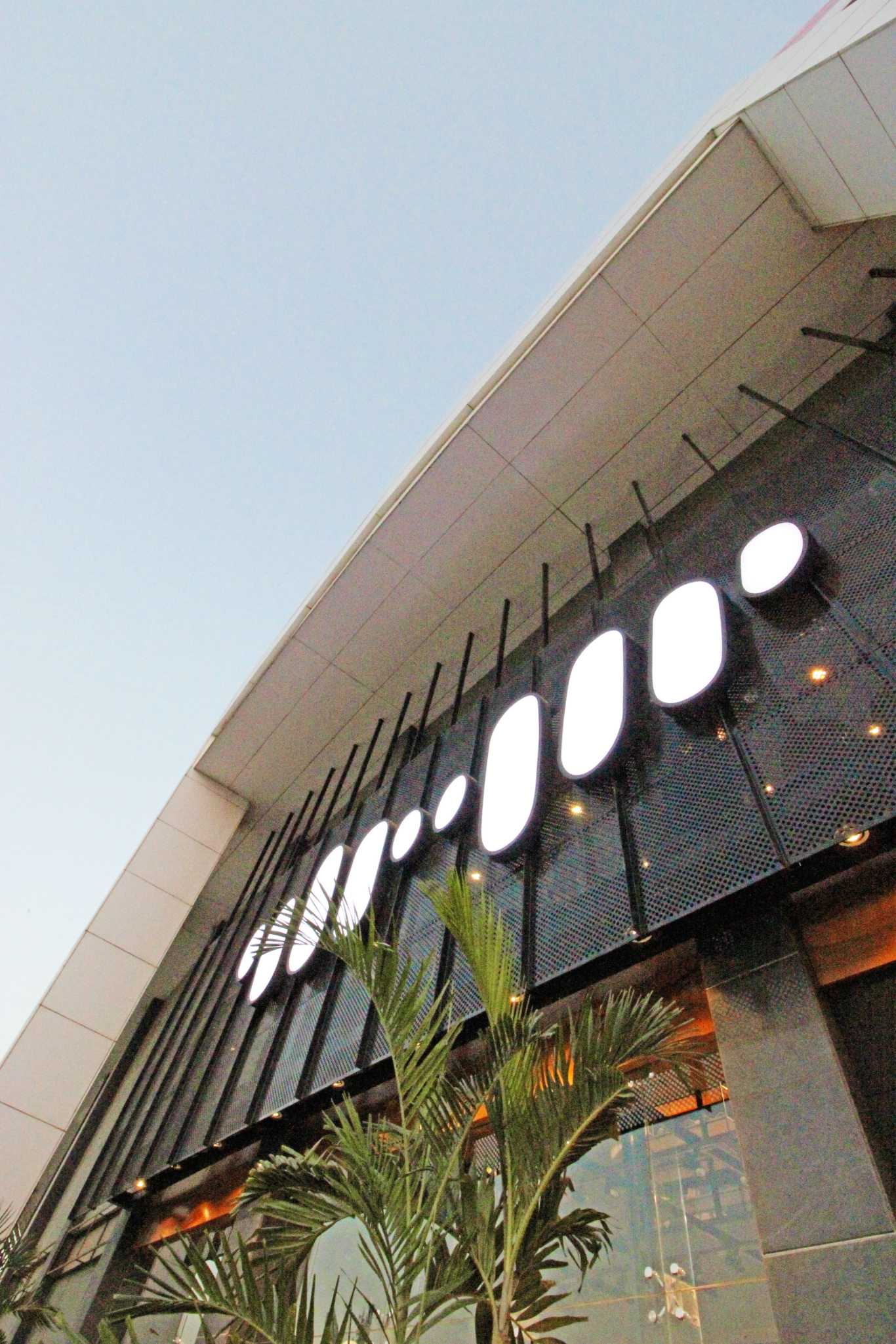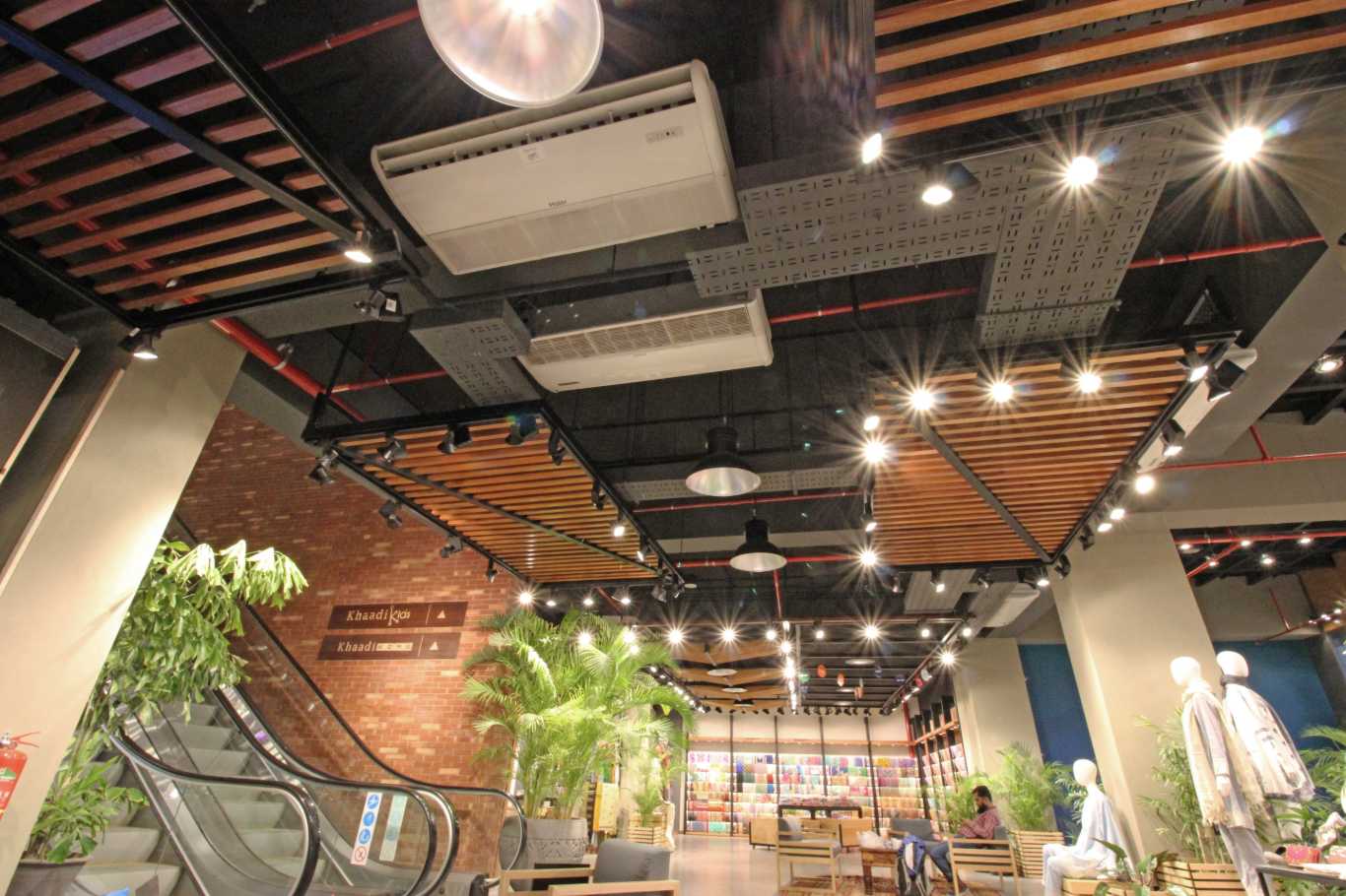 It is always difficult to design a huge retail store; specially one that has an elevation exposed to the elements. A perforated metal screen spanning over 100’0” was designed to visually tie the elevation together. In the interior, huge chunks of slabs were removed to connect the ground floor to the first floor. Even though the span in plan, and in volume is huge; the suspended metal and wooden ceiling with wire mesh as a tying medium is able to create an aesthetical and simultaneously a sensible visual.